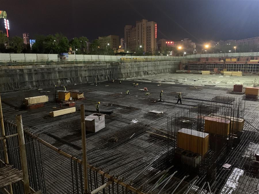 時至深夜,贛州市人民醫(yī)院新院職工交流房項目工作人員依舊奮戰(zhàn)在施工現(xiàn)場,現(xiàn)場機械轟鳴聲、焊接切割聲交織在一起,一片熱火朝天的大干景象。目前,130余名施工作業(yè)人員全面鋪開各個工作面,底板防水施工、承臺鋼筋綁扎、磚胎膜砌筑、樁頭破除、地下室頂板架子搭設(shè)和模板安裝等工作都在有序推進,各班組都在按照計劃加班加點推進項目建設(shè)進度。