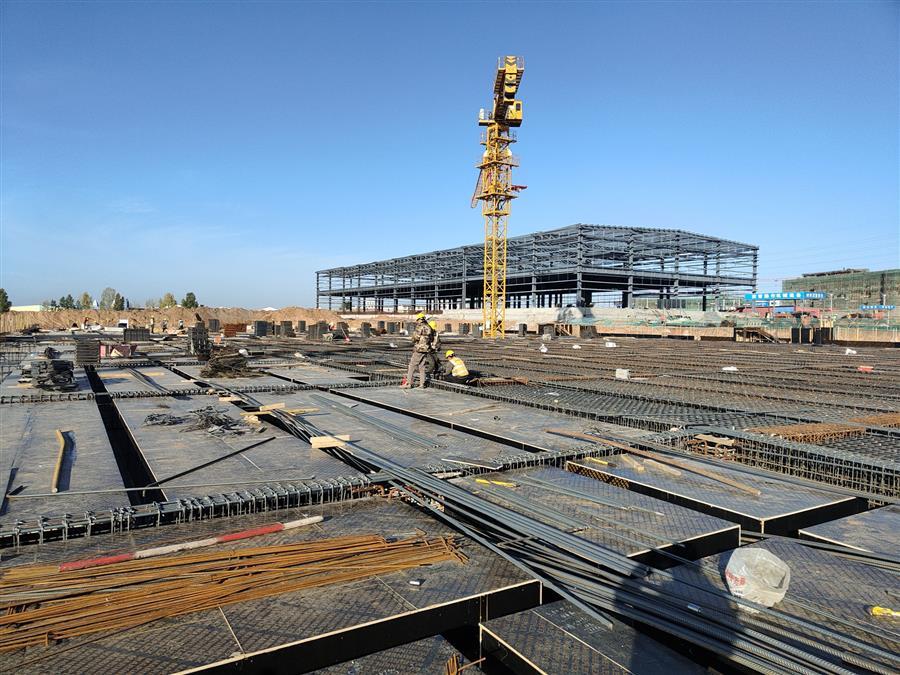 合肥公交集團廬陽停保場復建EPC工程,國慶期間有100多名工人加班作業(yè),目前項目正在進行停車樓一區(qū)三層頂梁板澆筑。