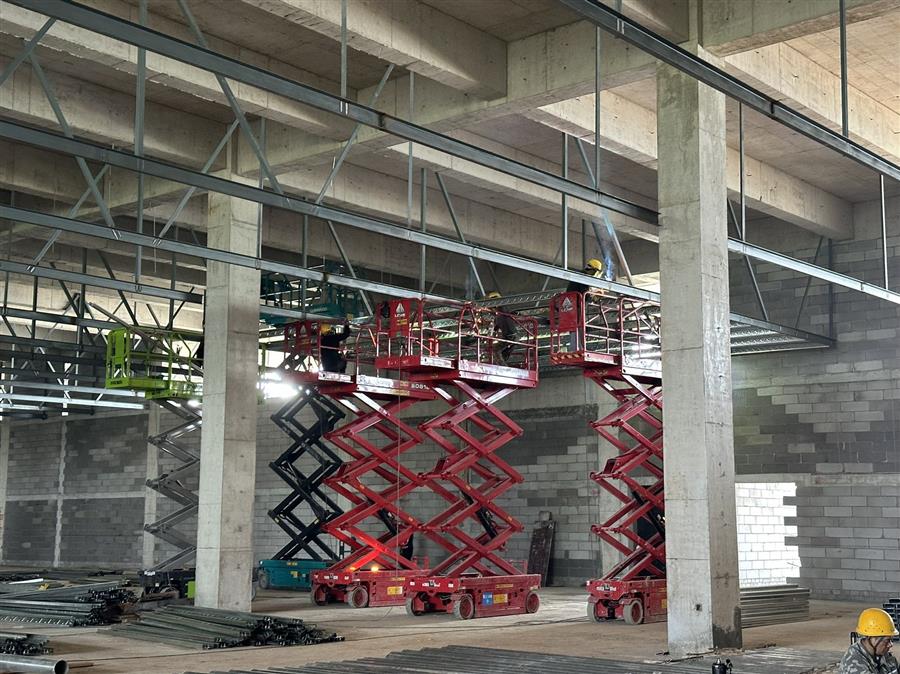 融水縣和睦產業(yè)園項目加班進行安裝屋面鋼絲、涂刷防火材料及場地平整。