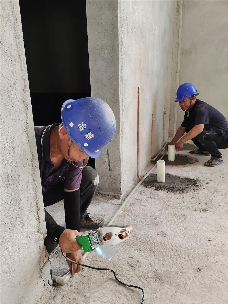 廣西思高香料有限公司食品香精香料及煙用添加劑生產基地項目辦公綜合樓、1#-3#廠房及門衛(wèi)室項目,工人在安裝管道。