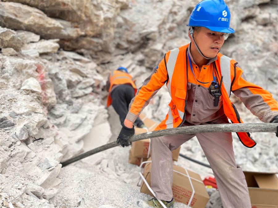 柳州市柳北區(qū)石碑坪古木村石灰?guī)r礦爆破工程,爆破作業(yè)人員正在進行裝藥、網絡延時設置等作業(yè)。