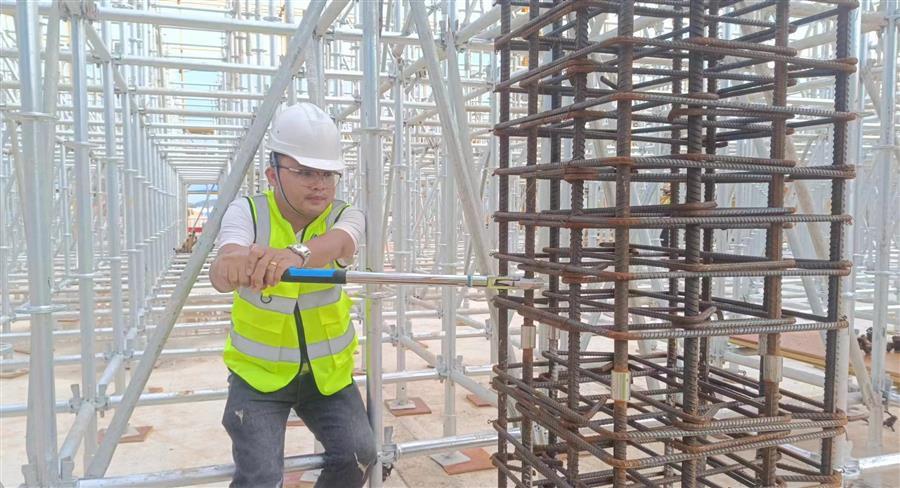 鹿寨智慧林業(yè)零碳循環(huán)產業(yè)園項目,管理人員正在進行鋼筋套筒扭矩測試。