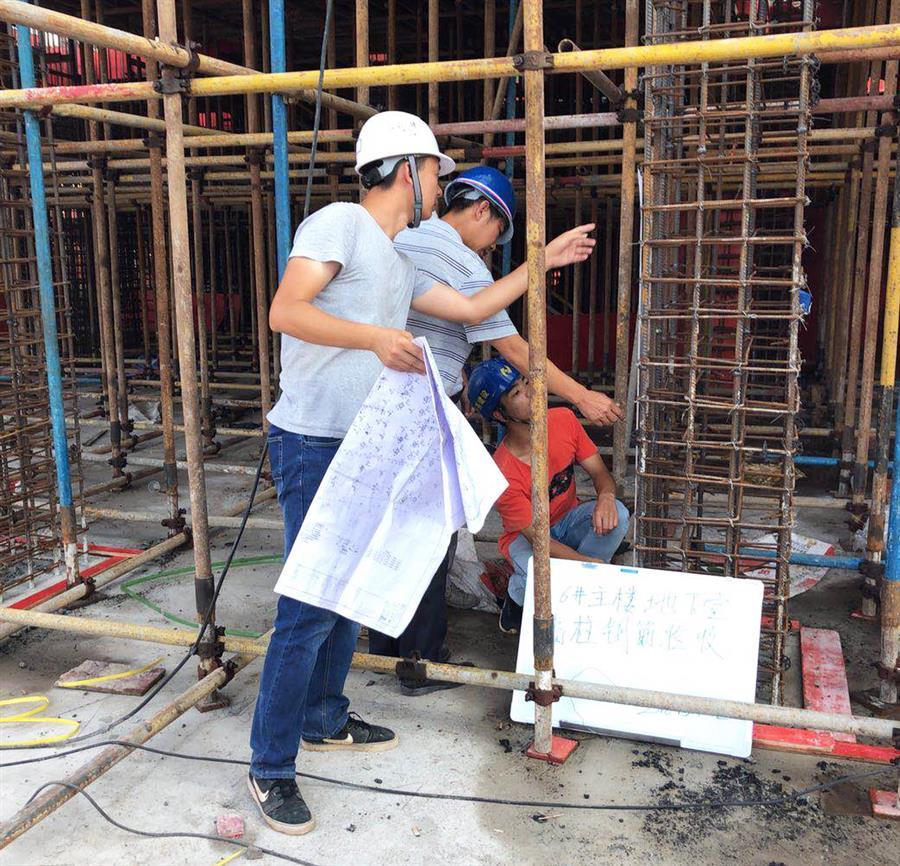 6月18日,在桂華分公司承建的梧州佛子時(shí)代廣場項(xiàng)目現(xiàn)場,當(dāng)空烈日讓偌大的工地一片熾熱,焊花飛濺,工程車來來往往,工人們揮汗如雨。雖然施工作業(yè)已經(jīng)避開了高溫時(shí)段,但工人們?nèi)员缓顾粤搜劬?,濕了衣服。盡管這樣,大家仍堅(jiān)持“全副武裝”,手套、防護(hù)用具,安全帽,一樣都沒有少,自覺遵守安全文明施工相關(guān)規(guī)范。入行兩年的施工員趙俊財(cái)抹了一把汗說道:“剛參加工作時(shí),不能和家人一起過節(jié)還挺難受的,后來把心態(tài)調(diào)整好了,想著只要家人安好,其實(shí)比什么都重要,趁著年輕,還是應(yīng)該多奮斗?!笨粗幻装舜髠€(gè)的他手拿圖紙和卷尺,蜷縮著身子,蹲在空間有限且熱得發(fā)燙的平臺(tái)上仔細(xì)檢查剛剛綁扎好的鋼筋籠,驕陽烤得他黝黑的皮膚泛出一層水光,襯著那還略顯年輕的臉龐,顯得熠熠生輝。