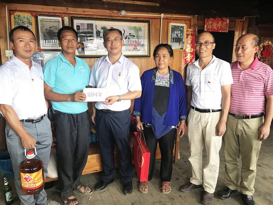 烏杠屯地處深山,道路崎嶇,許多貧困戶(hù)的家無(wú)法通車(chē),一公司慰問(wèn)小組肩扛大米、手提花生油等物資,一路步行上山,將慰問(wèn)品一戶(hù)戶(hù)送到貧困戶(hù)手中。